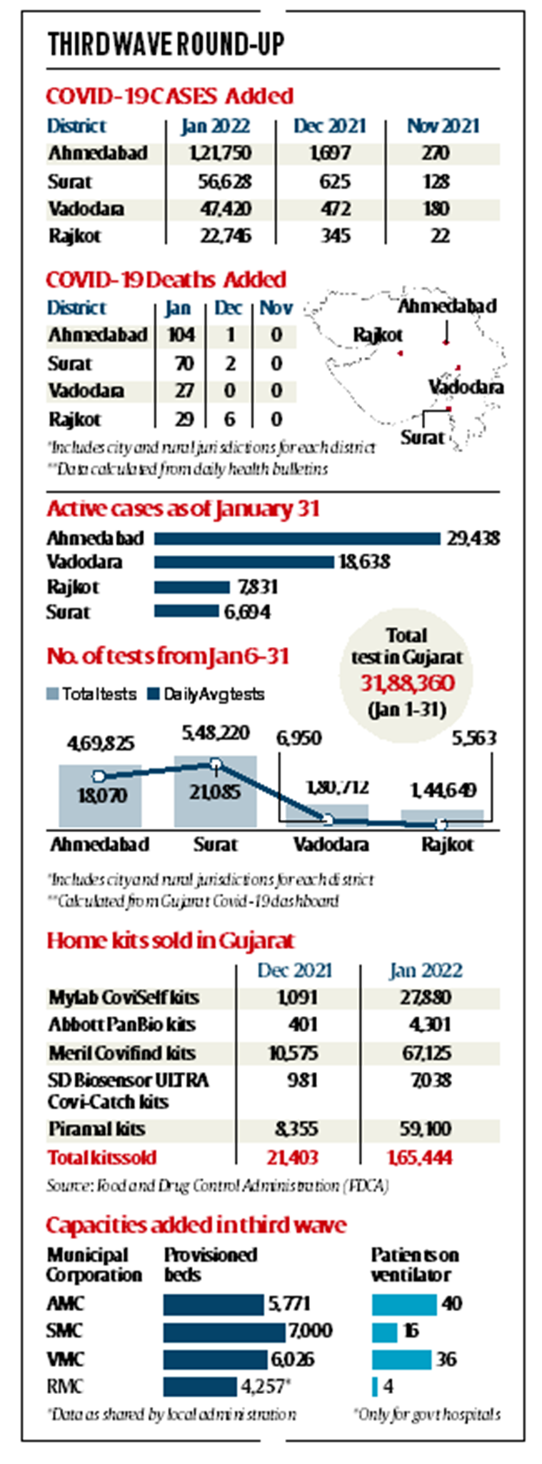 Gujarat reported its first Omicron variant case on December 4 in a 72-year-old non-resident Indian (NRI) man who landed in Jamnagar city from Zimbabwe on November 28. In the surge that began after Christmas, cases went up to 24,485 on January 20 (from 1,069 on January 1), which the state health department considers the “peak” of the third wave. State health minister Rushikesh Patel also said that almost 80 per cent of these cases were assumed to be of the Omicron variant.