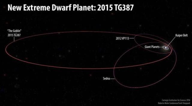 Why ‘The Goblin’? Two reasons: one, its provisional name, 2015 TG387, contains the initials TG; two, it was discovered close to Halloween. At the time of discovery, announced Tuesday, the Goblin was 80 astronomical units (AU) from the Sun (1 AU is equal to the distance between the Earth and the Sun). At its closest, the Goblin is 65 AU from the Sun. It orbits the Sun once in 40,000 years.
