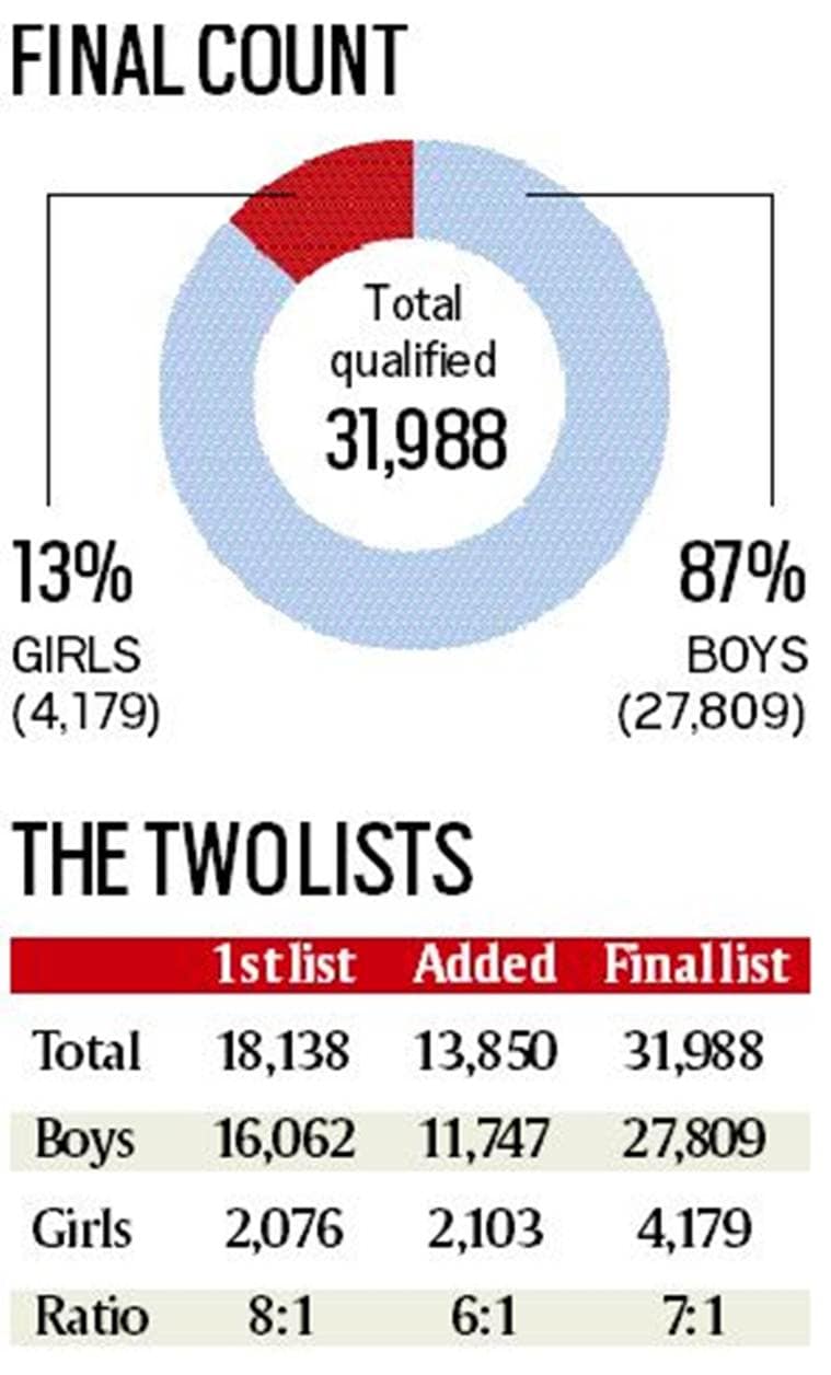 JEE-Advanced authorities released an extended merit list for 2018 recently, following intervention by the government amid concerns whether the number of candidates in the original list was enough to ensure that all available seats would be filled up. From roughly 18,000 candidates for admission to the IITs, the list has now been extended to almost 32,000. Boys continue to outnumber girls — now at nearly 28,000 to 4,000, or 7 to 1.