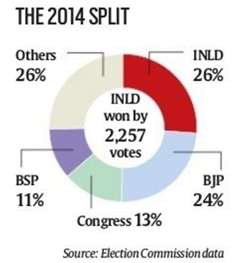 In 2000 and 2005, the INLD finished second to the Congress, running the winner close in 2000 and losing by a much larger margin in 2005. The late Harichand Midha won the seat for the INLD in the next two elections. In 2009, he defeated his Congress rival by nearly 8,000 votes. In 2014, the contest was between Midha and the BJP, which lost by just over 2,000 votes, while the Congress was relegated to a distant third. The BJP polled 24% of the vote in 2014, behind INLD’s 26%. In the previous three polls, the BJP had finished fourth in 2000, fourth in 2005 and seventh in 2009, polling less than 10% each time.