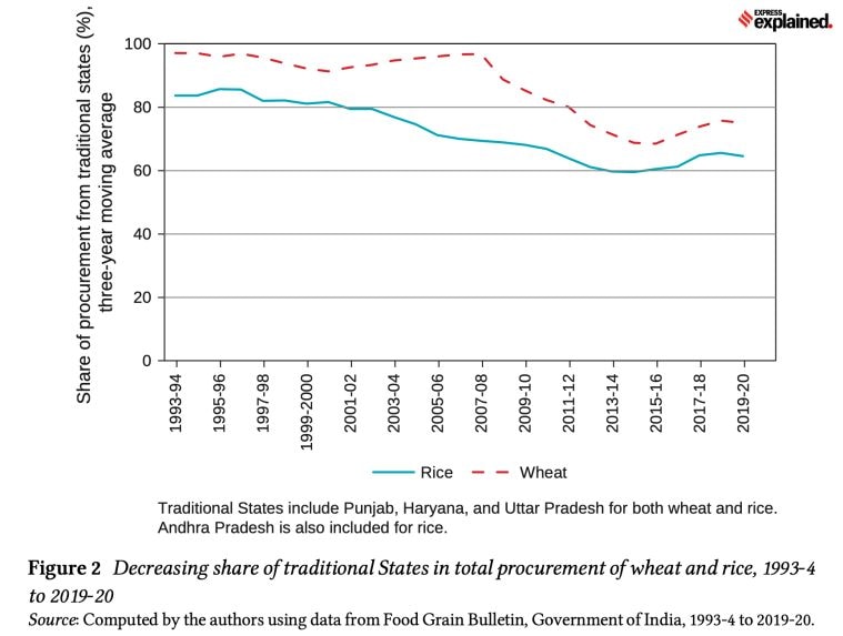 “These data suggest that several states that were not historically involved in public procurement have emerged as significant regions of procurement, notably Madhya Pradesh for wheat, and Odisha and Chhattisgarh for rice,” they write.