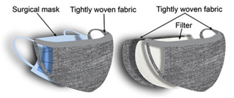 # A cloth mask tightly on top of a surgical mask where the surgical mask acts as a filter and the cloth mask provides an additional layer of filtration while improving the fit; or
