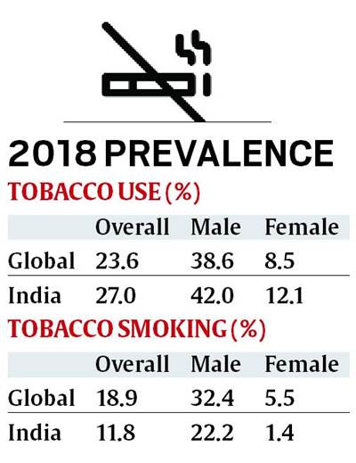 In India, which had a 44% prevalence of tobacco use (male and female combined) in 2000, this is expected to reduce almost by half to 22.3% by 2025. Globally, the prevalence was at 33.3% in 2000, and is projected to reach 20.9% in 2025.