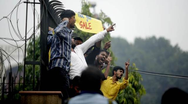 JNU Students protest outside UGC against fee hike in New Delhi on Wednesday. (Express Photo by Praveen Khanna)