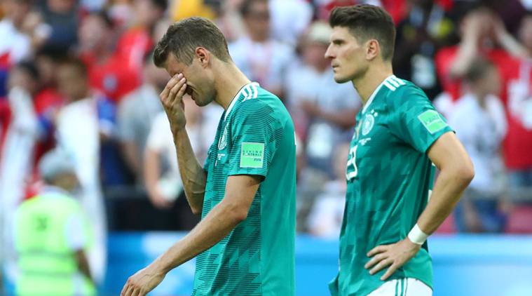 Germany’s Thomas Muller and Mario Gomez look dejected after the match. Germany was knocked out of the World Cup after they suffered a shocking 2-0 defeat against South Korea on Wednesday. (Source: REUTERS)