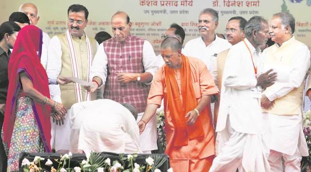Union Home Minister Rajnath Singh, Chief Minister Yogi Adityanath and others at the loan waiver certificate distribution programme in Lucknow on Thursday. Express
