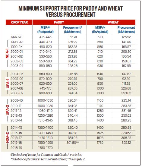 The Narendra Modi government, in its last year in office, has played catch-up with the previous Congress-led United Progressive Alliance regime vis-à-vis fixing minimum support prices (MSP) for crops. This is especially in paddy and wheat, where the MSPs, unlike for other crops, are reasonably enforced through governmental procurement.