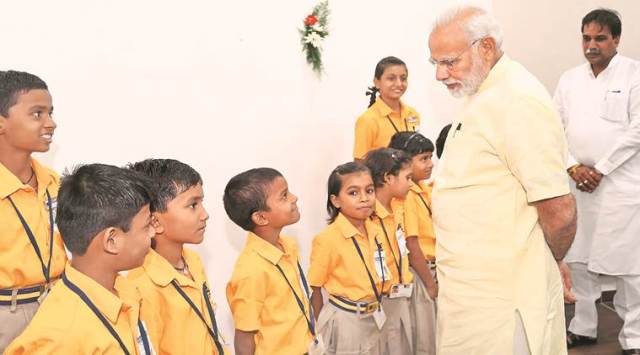 Prime Minister Narendra Modi interacts with schoolchildren in Naya Raipur on Thursday. PTI Photo