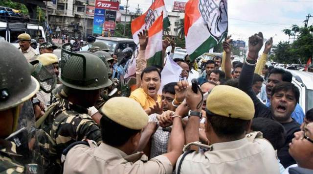 Congress workers being whisked away by police during a demonstration against BJP MP Kamakhya Prasad Tasa’s controversial remarks, in front of Rajiv Bhawan in Guwahati. (Source: PTI)