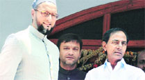 MIM chief Asaduddin Owaisi with TRS president K Chandrasekhar Rao at his residence in Hyderabad on Thursday.(Source: PTI)