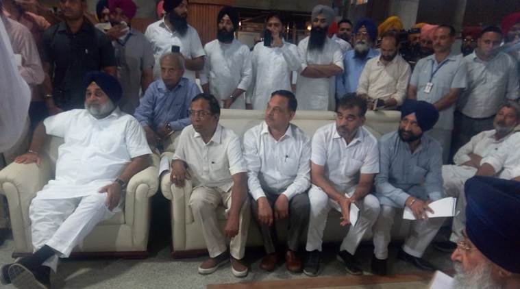 Mock assembly by SAD leaders in the lobby of Punjab Vidhan Sabha. (Express photo by Kamleshwar Singh)