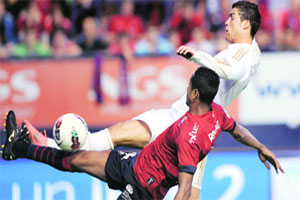 While Osasuna threatened a brief comeback after the break through a Juan Francisco Nino header,Ronaldo struck again after 69 minutes and Higuain wrapped up the scoring in the 77th. A minute from the end,Osasuna substitute Roland Lamah was dismissed for a second yellow card as his teams six-match unbeaten run came to an end on the day that coach Jose Luis Mendilibar had extended his contract for another year. We scored from the first chance that we had with a goal which was out of this world and the second was also fantastic, said Real coach Jose Mourinho.