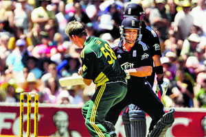 Brief scores: England 299-8 (J. Trott 102,M. Prior 67; D. Hussey 4-21,S. Smith 3-33) vs Australia 278-7 off 50 overs (S. Watson 64,C White 44,S Smith not out 46; J Anderson 2/57,J Trott 2/31)