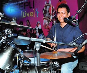 Aamir Khan literally drummed out a surprise for all the high-profile guests and the extensive media guests at the music launch of his co-production with UTV Motion Pictures,the satire Peepli [Live at a mid-town Mumbai pub on July 13. He himself played and pretty well too! on the percussion during the performance of the last-presented track,Zindagi se darte ho,performed by the Indian Ocean,one of the five songs on the films original soundtrack album. Both his turn at the beats as well as the fact that the song was one of the last renditions of the late Asheem Chakravorty,founder of the band Indian Ocean,who passed away in 2009,made the crowd ask for an encore. In a milleu where music release functions are an insipid norm every month,there are very few such functions each year that stand out. This one certainly did,for all the tracks of the film were presented on stage by the artistes who feature on the album too. Indian Ocean members Susmit Sen (Electric & Acoustic Guitar),Rahul Ram (Bass Guitars & Vocals) and Amit Kilam (Drums,Gabgubi and Vocals) also performed the rousing Des mera rangrez yeh babu to a thundering ovation,and if you thought that applause was restricted to a music band,the cheering was equally wild for the two rural ditties presented from the film. Mehangai daayan,a traditional village song that is sung by the Bhadwai Village Mandali along with actor Raghubir Yadav within the film was also performed at the venue by the same artistes,with the Mandali specially present in Mumbai for the occasion. Similarly Nageen Tanvir performed her composition Chola maati ke Ram,which also got deafening applause. Tributes were also paid to Indian Oceans Aseem Chakravorty and Noon Meem Rashed. The entire team of the film,headed by producers Aamir Khan and Kiran Rao,co-producer Ronnie Screwvala,writer-director Anusha Rizvi,the principal cast and technicians of the film and the music team were also present,including Swanand Kirkire,who has co-written Des mera and Ram Sampat,who has remixed a version of Mehangai daayan on the album. T-Series honchos Bhushan Kumar,Mukesh Desai and Vinod Bhanushali were also spotted.And the event also boasted of one of the greatest turnover seen at such a show in recent times. Shantanu Moitra,Prasoon Joshi,Rani Mukerji,Sharman Joshi,Rajkumar Hirani,Karan Johar,Ashutosh Gowariker,Rakeysh Omprakash Mehra and crooner Sona Mahapatra were also among the guests.