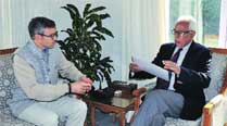Omar submits his resignation to J&K Governor N N Vohra in Jammu on Wednesday. (Source: Express photo by Shuaib Masoodi)