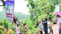 A group of men, apprehending that the team is there to remove the publicity materials, walks towards Arundev. Satheesh stops them and says, “If you do not remove them, we will do so and the cost will be charged to the candidate.” The men don’t budge. The team cuts the festoons and posters, and takes them along.