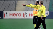 India coach Terry Walsh and captain Sardar Singh gesture during a training session on Thursday. India, ranked 10th in the world, are playing the World League Finals by virtue of being the hosts (IE Photo: Ravi Kanojia)