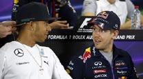 Sebastian Vettel (R) of Germany reacts as he talks with Mercedes team driver Lewis Hamilton of Britain during a news conference in Melbourne (Reuters)