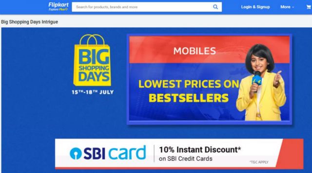 Flipkart Big Shopping Days sale, offers: Flipkart will be hosting the Big Shopping Days sale from July 15-18, 2019. During this four day sale period, customers will be getting an instant discount of 10 per cent on making a payment through SBI credit cards. Also, the Flipkart Plus customers will be getting early access to the sale.