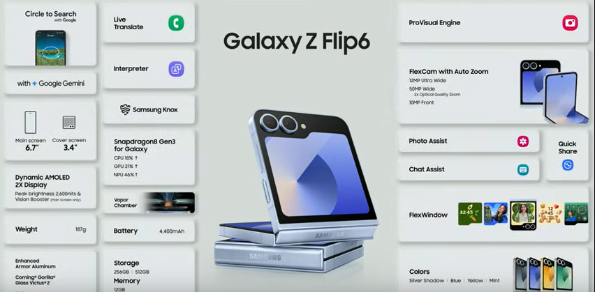 The all-new Galaxy Z Flip 6 comes with a 50 MP primary camera powered by the Pro Visual Engine. Detailed images and enhanced AI offer high-performance zoom with up to 10x. Capture photos hands-free with Flex Cam, which includes auto zoom that finds the best scenes for your pictures. Get everyone in one shot with auto zoom. Another feature, Instant Slow Motion, makes images dramatic. All of these features are powered by its fastest processor on a Z Flip yet, the Snapdragon 8 Gen 3, with a 4000 mAh battery. It is the strongest Flip yet with its robust hinge.