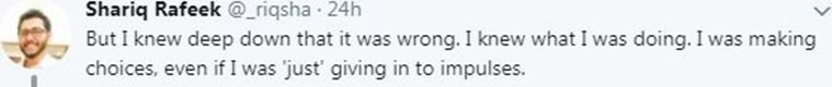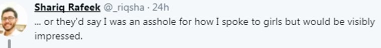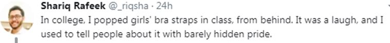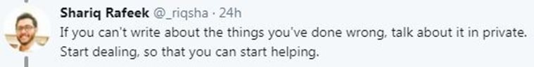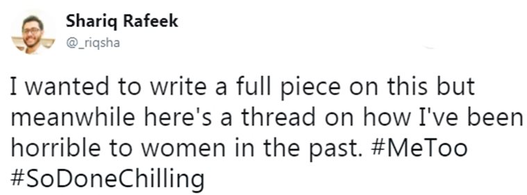Although women are sharing their narrative, it goes without saying that there is also an onus on men to share their reckless behaviour. And while some are indeed sharing it, Shariq Rafeek, a writer by profession, shared a Twitter thread on how he “had been bad in many ways”, behaved “pushy” and “lewd” with women in the past and derived fun out of it. But he is “#SoDoneChilling”, he writes and has not hesitated in taking complete responsibility for his actions.