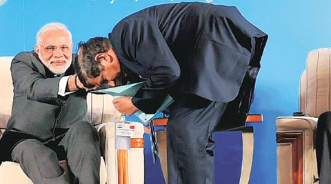 A businessman seeking blessings of the PM at the Shanghai event Saturday. Later, Modi asked crowd to bless him. (Source: PTI)Taking on criticism directed at his foreign trips, Prime Minister Narendra Modi said here Saturday that he was being targeted for “tireless” work and that if this was a “crime”, he would continue to do it.