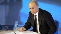One questioner was interrupted by chants of “Thank you, thank you” as members of the crowd, many waving the Russian tricolour, expressed their gratitude to Putin for absorbing Crimea into Russia.