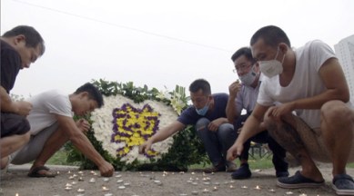 At the now-evacuated Seaport City housing complex, 33-year-old Fan Jie joined other residents in lighting candles for first-responders killed in the explosions.