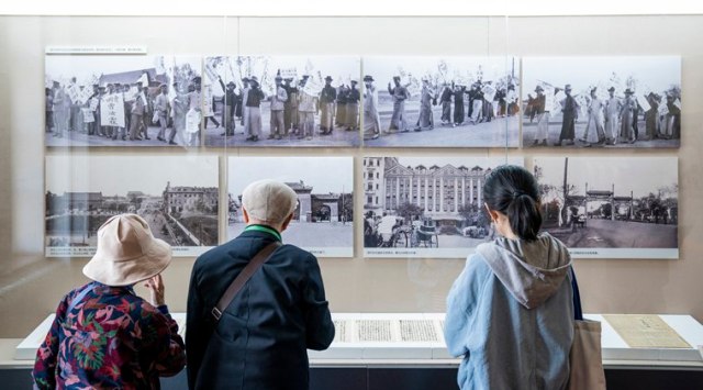 Visitors looking at photos of the May Fourth student protest at the exhibition, “A Panorama of the May Forth Movement,” in the New Culture Movement Memorial Museum in Beijing, April 26, 2019. (The New York Times: Yan Cong)