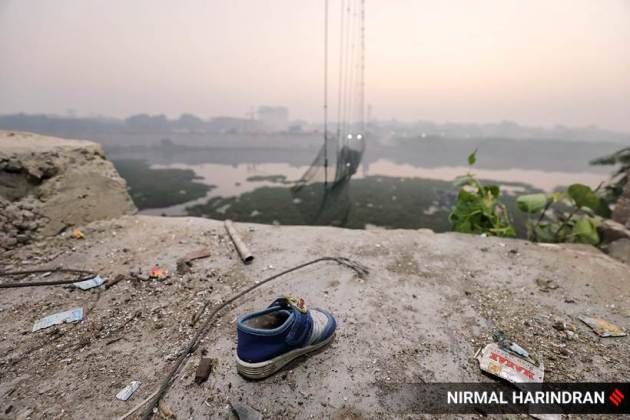Remains of tragedy near the entrance of Morbi's Jhoolto Pul collapse site in Gujarat. As many as 55 of the 135 victims of the accident were children. (Express photo by Nirmal Harindran)